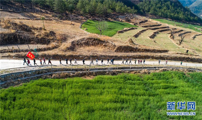 “精準(zhǔn)扶貧感恩連”在云南香格里拉市五境鄉(xiāng)開展植樹活動(dòng)(3月13日無人機(jī)拍攝)。新華社記者 胡超 攝