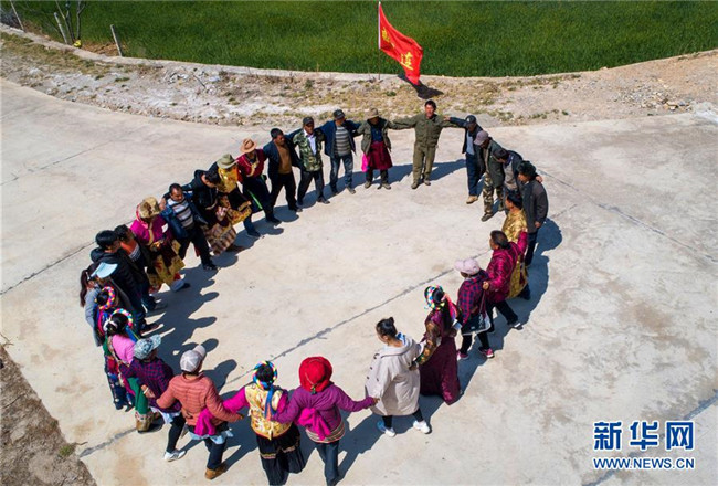在云南香格里拉市五境鄉(xiāng),“精準(zhǔn)扶貧感恩連”隊(duì)員在跳鍋莊(3月13日無人機(jī)拍攝)。新華社記者 胡超 攝