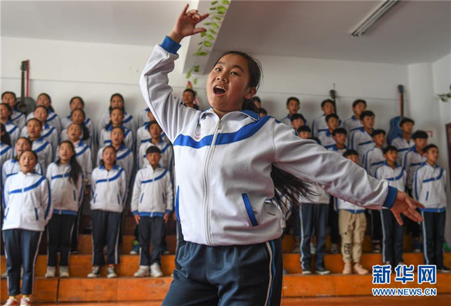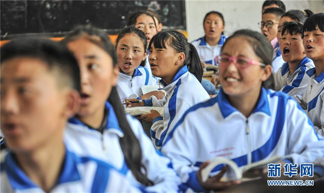 鹽井中學(xué)的學(xué)生們在上英語課(6月6日攝)。年輕的藏族女教師坐在鋼琴前,手指靈動地彈奏樂曲,兩名學(xué)生拉起弦子伴奏,三十多名學(xué)生站成四排,齊聲合唱。學(xué)校籃球場上數(shù)名身材高大的學(xué)生,正在體育老師的組織下進(jìn)行激烈的分組對抗,不一會兒,學(xué)生們個個汗流浹背。綜合樓三樓的化學(xué)實驗室內(nèi),身穿白色大褂的學(xué)生,分成若干小組,正在做簡單的化學(xué)實驗。這一幕幕,同時出現(xiàn)在西藏昌都市芒康縣鹽井中學(xué)。新華社記者晉美多吉攝