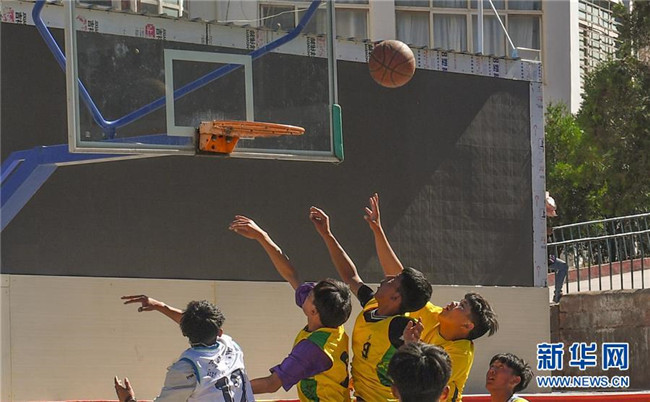 鹽井中學(xué)的學(xué)生們在體育課上打籃球(6月6日攝)。年輕的藏族女教師坐在鋼琴前,手指靈動地彈奏樂曲,兩名學(xué)生拉起弦子伴奏,三十多名學(xué)生站成四排,齊聲合唱。學(xué)?;@球場上數(shù)名身材高大的學(xué)生,正在體育老師的組織下進(jìn)行激烈的分組對抗,不一會兒,學(xué)生們個個汗流浹背。綜合樓三樓的化學(xué)實驗室內(nèi),身穿白色大褂的學(xué)生,分成若干小組,正在做簡單的化學(xué)實驗。這一幕幕,同時出現(xiàn)在西藏昌都市芒康縣鹽井中學(xué)。新華社記者晉美多吉攝