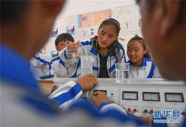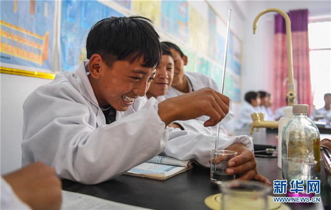 鹽井中學(xué)的學(xué)生們在上化學(xué)課(6月6日攝)。年輕的藏族女教師坐在鋼琴前,手指靈動地彈奏樂曲,兩名學(xué)生拉起弦子伴奏,三十多名學(xué)生站成四排,齊聲合唱。學(xué)?;@球場上數(shù)名身材高大的學(xué)生,正在體育老師的組織下進(jìn)行激烈的分組對抗,不一會兒,學(xué)生們個個汗流浹背。綜合樓三樓的化學(xué)實驗室內(nèi),身穿白色大褂的學(xué)生,分成若干小組,正在做簡單的化學(xué)實驗。這一幕幕,同時出現(xiàn)在西藏昌都市芒康縣鹽井中學(xué)。新華社記者晉美多吉攝