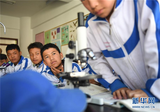 鹽井中學(xué)的學(xué)生們在上生物課(6月6日攝)。年輕的藏族女教師坐在鋼琴前,手指靈動地彈奏樂曲,兩名學(xué)生拉起弦子伴奏,三十多名學(xué)生站成四排,齊聲合唱。學(xué)校籃球場上數(shù)名身材高大的學(xué)生,正在體育老師的組織下進(jìn)行激烈的分組對抗,不一會兒,學(xué)生們個個汗流浹背。綜合樓三樓的化學(xué)實驗室內(nèi),身穿白色大褂的學(xué)生,分成若干小組,正在做簡單的化學(xué)實驗。這一幕幕,同時出現(xiàn)在西藏昌都市芒康縣鹽井中學(xué)。新華社記者晉美多吉攝