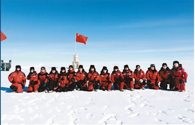 1月16日,中國第35次南極科考隊(duì)昆侖隊(duì)隊(duì)員來到海拔4093米的南極冰蓋最高點(diǎn)冰穹A,在南極冰蓋之巔換上了一面嶄新的國旗。圖為隊(duì)員們在此處合影。新華社記者 劉詩平攝