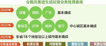 征求意見稿提出將加快建立分類投放、分類收集、分類運輸、分類處置的生活垃圾處理系統(tǒng),促進城鄉(xiāng)生活垃圾減量化、資源化、無害化,統(tǒng)籌推進其他固體廢物處理處置,努力改善城鄉(xiāng)人居環(huán)境。到2020年,成都、德陽、廣元3個國家重點城市基本建成生活垃圾分類處理系統(tǒng),生活垃圾回收利用率達(dá)到35%以上;到2022年,攀枝花、瀘州、綿陽、遂寧4個省級示范城市的中心城區(qū)基本建成生活垃圾分類處理系統(tǒng);到2025年,全省18個地級及以上城市基本建成生活垃圾分類處理系統(tǒng)。