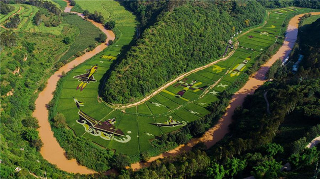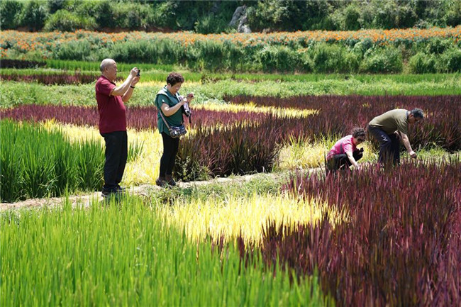云南省昆明市宜良縣著力打造創(chuàng)意農(nóng)業(yè)、景觀農(nóng)業(yè)、實現(xiàn)“以農(nóng)帶旅、以旅興農(nóng)”的產(chǎn)業(yè)發(fā)展,其中種植的數(shù)百畝彩色稻田,在田間繪制了各類美麗畫卷,吸引眾多游客前來觀光。 新華社記者 秦晴 攝