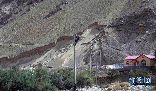 在新疆喀什地區(qū)塔什庫(kù)爾干塔吉克自治縣馬爾洋鄉(xiāng),工人在登桿布線(xiàn)(9月7日攝)。 新華社記者 張嘯誠(chéng) 攝