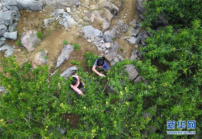農(nóng)民在貴州省印江縣朗溪鎮(zhèn)昔蒲村的石漠化治理區(qū)采摘桃子(6月26日無(wú)人機(jī)拍攝)。 近年來(lái),貴州省圍繞產(chǎn)業(yè)選擇、培訓(xùn)農(nóng)民、技術(shù)服務(wù)、資金籌措、組織方式、產(chǎn)銷對(duì)接、利益聯(lián)結(jié)、基層黨建等“八要素”,通過(guò)“減、融、服”創(chuàng)新推進(jìn)農(nóng)村產(chǎn)業(yè)結(jié)構(gòu)調(diào)整,既帶動(dòng)了農(nóng)戶增收,也推動(dòng)了特色產(chǎn)業(yè)做大做強(qiáng)。 新華社記者 楊文斌 攝