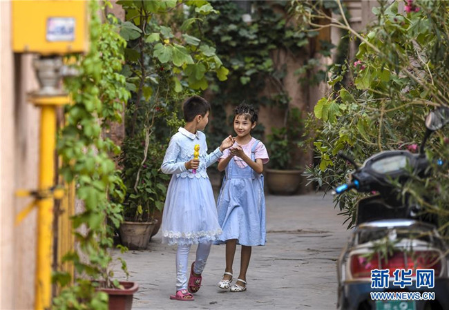 在新疆喀什古城景區(qū)內(nèi),當(dāng)?shù)貎擅∨笥炎咴谙锏纼?nèi)(8月12日攝)。新華社記者 王菲 攝