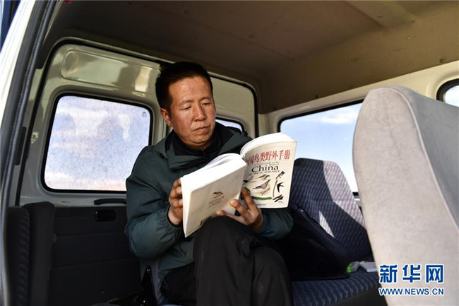 9月25日,青海湖國(guó)家級(jí)自然保護(hù)區(qū)管理局的巡湖觀測(cè)人員王延明在巡湖間隙閱讀中國(guó)鳥類野外手冊(cè)。