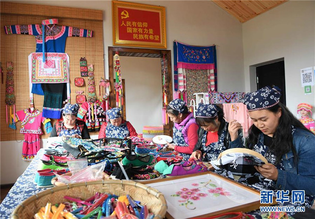 10月16日,團結(jié)村的幾名“巧媳婦”在刺繡。新華社記者 楊宗友 攝