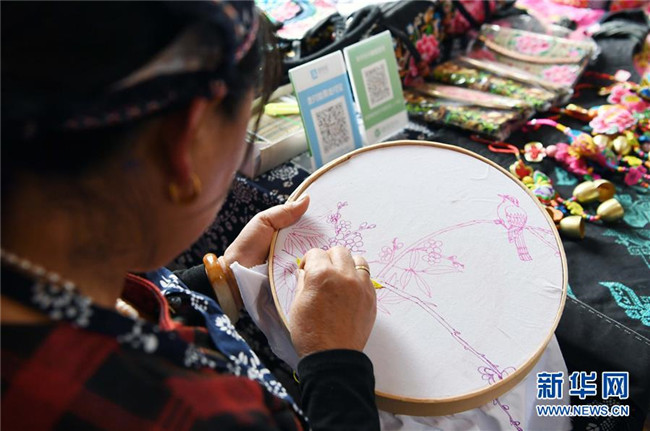 10月16日,團結(jié)村的一名“巧媳婦”在刺繡。 新華社記者 楊宗友 攝