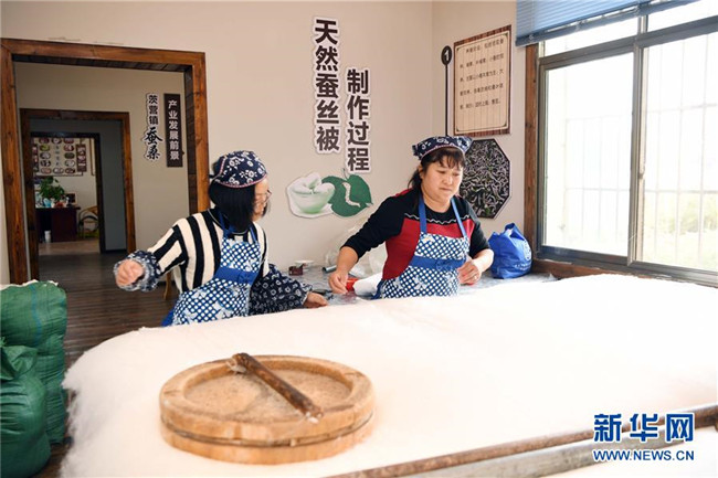 10月16日,團結(jié)村的“巧媳婦”龔粉珍(右)和張會敏在制作蠶絲被。 新華社記者 楊宗友 攝
