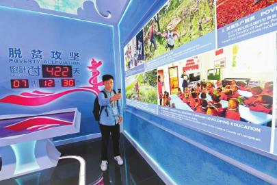 脫貧攻堅是幸福中國的生動詮釋。一塊脫貧攻堅倒計時422天的標(biāo)識牌引發(fā)圍觀,展示的脫貧攻堅8項(xiàng)主要成果中,四川占有兩席。作為教育脫貧的成果,一張照片展現(xiàn)了涼山州昭覺縣幼教點(diǎn)輔導(dǎo)員帶領(lǐng)幼兒學(xué)習(xí)普通話的場景;嚴(yán)把貧困退出關(guān),另一張照片則展示了第三方評估團(tuán)隊在甘孜州康定市開展貧困縣退出抽查的場景。