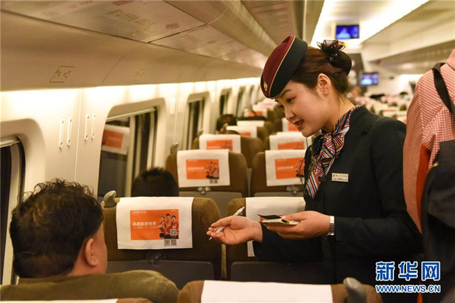 11月16日,在由烏魯木齊開(kāi)往哈密的D8804次動(dòng)車(chē)組列車(chē)上,列車(chē)乘務(wù)員為旅客檢票。新華社記者 丁磊 攝