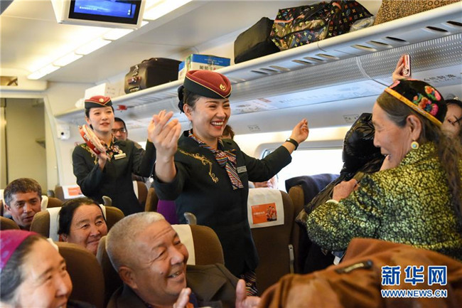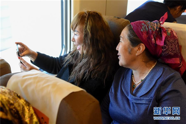 11月16日,在D8804次動(dòng)車(chē)組列車(chē)上,乘務(wù)員和乘客跳起舞慶祝蘭新高鐵新疆段開(kāi)通運(yùn)營(yíng)五周年。新華社記者 丁磊 攝