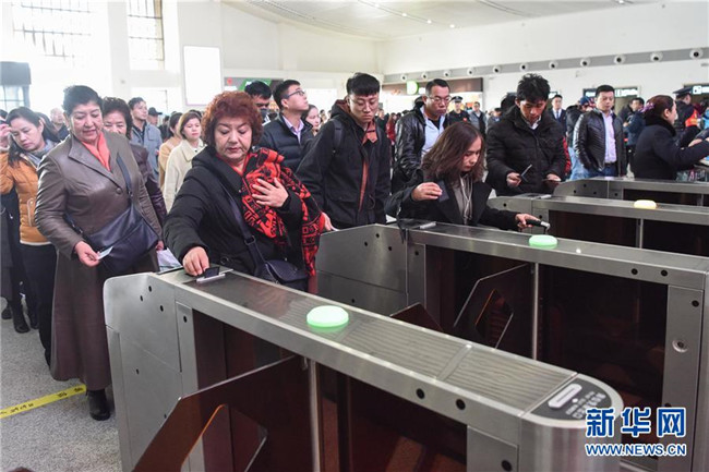 11月16日,乘坐D8803次動(dòng)車(chē)組列車(chē)的乘客在吐魯番北站檢票進(jìn)站。新華社記者 丁磊 攝