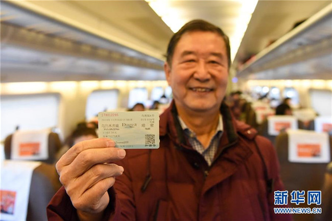 11月16日,在D8804次動(dòng)車(chē)組列車(chē)上,乘客張長(zhǎng)齡展示2014年11月16日蘭新高鐵新疆段開(kāi)通的首趟列車(chē)車(chē)票。新華社記者 丁磊 攝