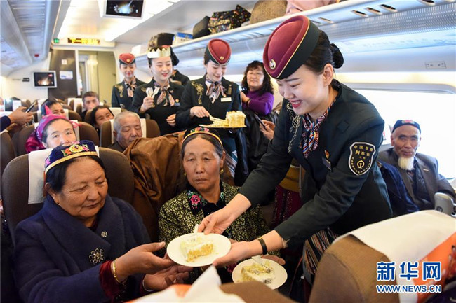11月16日,在D8804次動(dòng)車(chē)組列車(chē)上,乘務(wù)員為乘客送上蘭新高鐵新疆段開(kāi)通運(yùn)營(yíng)五周年的“生日”蛋糕。新華社記者 丁磊 攝