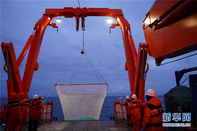 “雪龍2”號12月7日離開南大洋普里茲灣海域向西航行,開始對宇航員海海域展開科考作業(yè)??瓶缄爢T沿著本次宇航員海科考的首個調(diào)查斷面,自北向南做了多個站位的CTD(海水溫鹽深測量儀)采水作業(yè)、浮游生物垂直拖網(wǎng)作業(yè),以及魚類拖網(wǎng)和箱式采樣器等采樣作業(yè)。