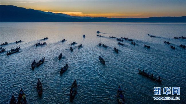 當(dāng)日,位于云南省玉溪市江川區(qū)的星云湖迎來一年一度的開湖捕魚季,600余艘漁船駛?cè)胄窃坪稉啤?星云湖是云南省九大高原湖泊之一,本次開湖捕魚時間將從2019年12月25日持續(xù)至2020年1月23日。 新華社記者 胡超 攝