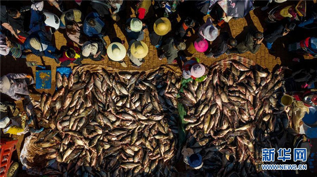 12月25日,人們在星云湖畔的老河咀魚市選購剛捕撈的鮮魚(無人機(jī)拍攝)。新華社記者 胡超 攝