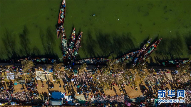 星云湖畔的老河咀魚市熱鬧非凡(12月25日無人機(jī)拍攝)。新華社記者 胡超 攝