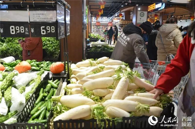 圖為日喀則超市內(nèi)市民選購蔬菜