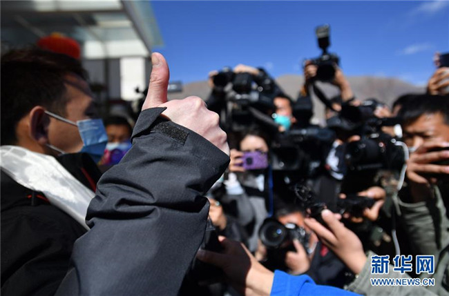 2月12日,在西藏自治區(qū)第三人民醫(yī)院,西藏唯一新冠肺炎患者治愈出院后豎起大拇指感謝醫(yī)護人員。新華社記者 覺果 攝