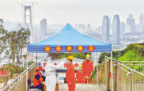 二月二十九日,在中鐵隧道三處重慶軌道交通十號(hào)線二期七星崗項(xiàng)目部,工人們正拉開(kāi)間距排隊(duì)測(cè)量體溫后進(jìn)入工地。通訊員 周勇 攝