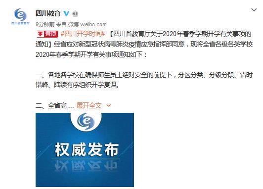 據(jù)四川省教育廳官方微博消息,四川省教育廳3月25日發(fā)布《關(guān)于2020年春季學(xué)期開學(xué)有關(guān)事項的通知》(以下簡稱《通知》)?!锻ㄖ贩Q,四川全省高三年級(含已報名參加高考的中等職業(yè)學(xué)校畢業(yè)年級學(xué)生)原則上由省上統(tǒng)籌于4月1日開學(xué),有條件的學(xué)校應(yīng)實行封閉式管理;初三年級由各市(州)統(tǒng)籌確定,可安排于4月7日開學(xué)復(fù)課。