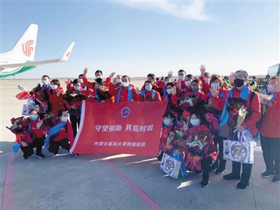 內(nèi)蒙古醫(yī)科大學附屬醫(yī)院的援鄂醫(yī)護人員在合影留念。