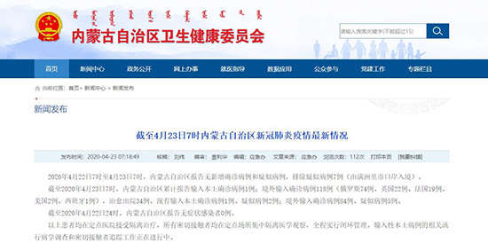 人民網(wǎng)呼和浩特4月23日電 (陳立庚)4月23日,記者從內(nèi)蒙古自治區(qū)衛(wèi)生健康委員會獲悉,2020年4月22日7時至4月23日7時,內(nèi)蒙古自治區(qū)報告無新增確診病例和疑似病例,排除疑似病例7例(由滿洲里市口岸入境)。