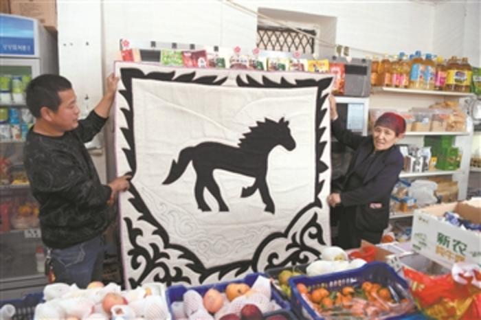 4月14日,在新疆托里縣多拉特鄉(xiāng)加瑪特村電子商務(wù)服務(wù)點負(fù)責(zé)人劉志江(左)與貧困戶馬合甫扎·阿勒木賽依提一起展示銷售的產(chǎn)品。 新華社記者 沙達(dá)提 攝