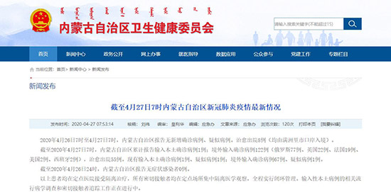 4月27日,記者從內(nèi)蒙古自治區(qū)衛(wèi)生健康委員會(huì)獲悉,2020年4月26日7時(shí)至4月27日7時(shí),內(nèi)蒙古自治區(qū)報(bào)告無新增確診病例、疑似病例。治愈出院8例(均由滿洲里市口岸入境)。