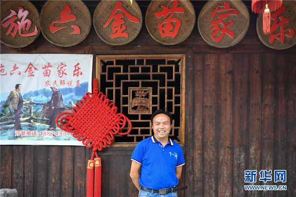 這是施六金在他的農(nóng)家樂(lè)前留影(4月25日攝)。1973年出生于十八洞村的施六金,由于父親患病很早就放棄學(xué)業(yè)和母親扛起了家庭的重?fù)?dān)。為了生活,他還曾遠(yuǎn)去東南亞打工。2015年,看到家鄉(xiāng)的變化,施六金回到村里開(kāi)起了農(nóng)家樂(lè),年度家庭人均純收入也從2014年的1715元增長(zhǎng)到了2019年的35696元。2018年,施六金與心愛(ài)的人組建了家庭。今年初,施六金與愛(ài)人迎來(lái)了一個(gè)大胖小子。“做人做事要懂得回報(bào)和感恩。”施六金給剛出生的兒子取名施澤恩。新華社記者薛宇舸攝