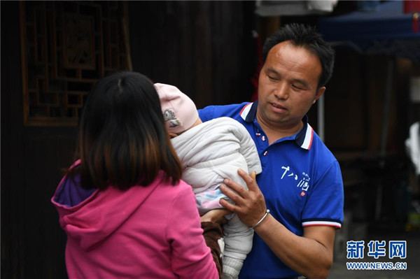 施六金(右)從妻子手中接過(guò)兒子施澤恩(4月25日攝)。1973年出生于十八洞村的施六金,由于父親患病很早就放棄學(xué)業(yè)和母親扛起了家庭的重?fù)?dān)。為了生活,他還曾遠(yuǎn)去東南亞打工。2015年,看到家鄉(xiāng)的變化,施六金回到村里開(kāi)起了農(nóng)家樂(lè),年度家庭人均純收入也從2014年的1715元增長(zhǎng)到了2019年的35696元。2018年,施六金與心愛(ài)的人組建了家庭。今年初,施六金與愛(ài)人迎來(lái)了一個(gè)大胖小子。“做人做事要懂得回報(bào)和感恩。”施六金給剛出生的兒子取名施澤恩。新華社記者薛宇舸攝