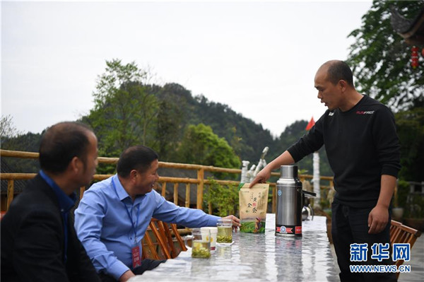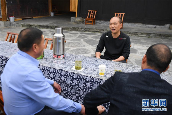 楊正邦(右)在為來(lái)自浙江的住客介紹十八洞村種植的“黃金茶”(4月25日攝)。楊正邦1978年出生于十八洞村,在外打工多年。近些年,眼看來(lái)十八洞村的游客越來(lái)越多,村里越來(lái)越熱鬧,楊正邦在2017年結(jié)束自己的打工生涯回鄉(xiāng)發(fā)展。他先是在村里擺起小吃攤,2018年開(kāi)起農(nóng)家樂(lè),去年又搭起新房子擴(kuò)建成民宿,年度家庭人均純收入從2014年的1923元增加到2019年的7173元。新華社記者薛宇舸攝