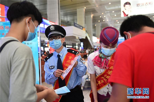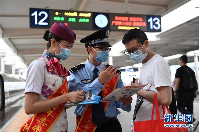 5月25日,在重慶北站北廣場(chǎng)站臺(tái),鐵路工作人員向旅客宣講鐵路安全知識(shí)和疫情防控知識(shí)。新華社記者 唐奕 攝