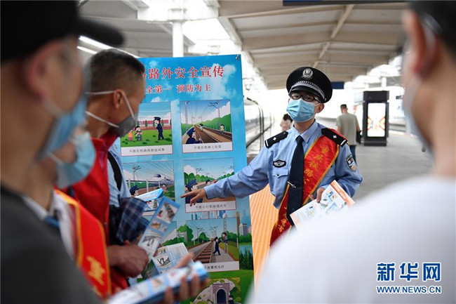 5月25日,在重慶北站北廣場(chǎng)站臺(tái),鐵路工作人員向旅客宣講鐵路安全知識(shí)和疫情防控知識(shí)。 新華社記者 唐奕 攝