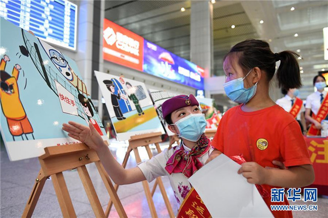 5月25日,在重慶北站北廣場(chǎng)候車廳,鐵路工作人員向小朋友宣講鐵路安全知識(shí)和疫情防控知識(shí)。新華社記者 唐奕 攝