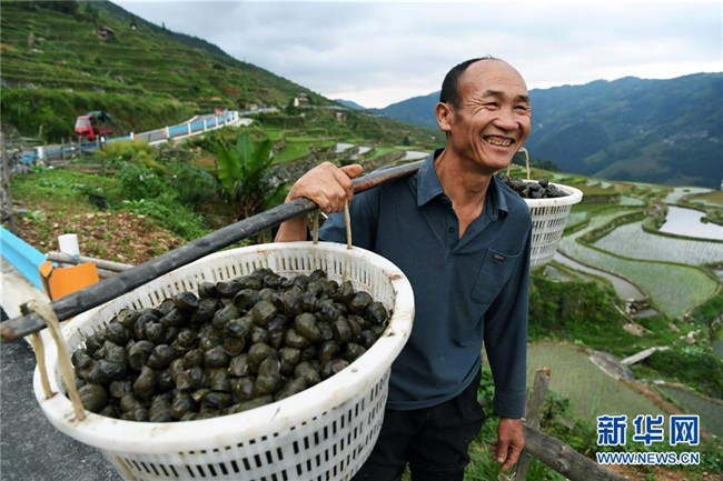 在田螺養(yǎng)殖過(guò)程中,采取“公司+合作社+農(nóng)戶(hù)”的模式,政府統(tǒng)一向龍頭公司采購(gòu)種螺交給合作社,合作社根據(jù)貧困戶(hù)水田規(guī)模和意愿發(fā)放種螺,同時(shí)公司技術(shù)人員入村開(kāi)展養(yǎng)殖技術(shù)培訓(xùn),田螺收獲時(shí)再由合作社對(duì)接種螺公司統(tǒng)一上門(mén)按保底價(jià)回收,解除了貧困戶(hù)養(yǎng)殖和銷(xiāo)售的后顧之憂,進(jìn)一步拓寬山區(qū)群眾脫貧增收渠道。 新華社記者 楊文斌 攝
