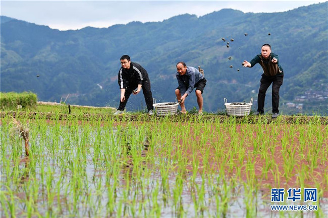 5月26日,貴州省黔東南州住建局派駐從江縣加榜鄉(xiāng)加車(chē)村的幫扶干部(左一、右一)幫助村民一起播撒種螺。