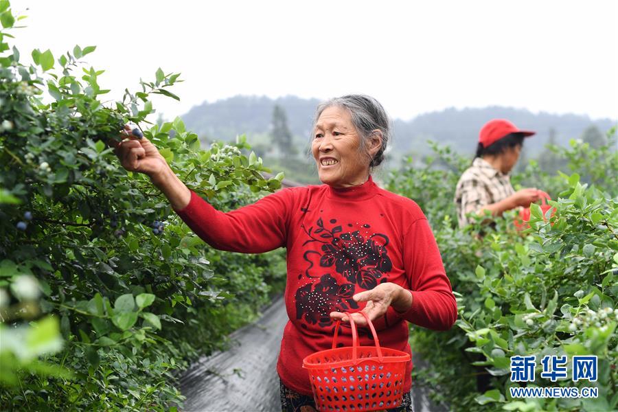 村民在茨竹鎮(zhèn)大面坡村藍(lán)桂香園藍(lán)莓基地采摘藍(lán)莓。新華社記者 王全超 攝