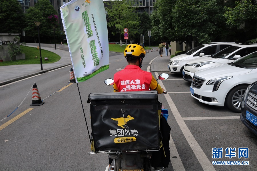 送完這一單后,周歡匆匆趕往下一個(gè)送餐點(diǎn)。“未來(lái),將有更有人在點(diǎn)外賣(mài)時(shí),不僅會(huì)收到美食,還會(huì)收獲一份特殊的‘禁毒外賣(mài)’”。新華網(wǎng)發(fā) (滕華 攝)