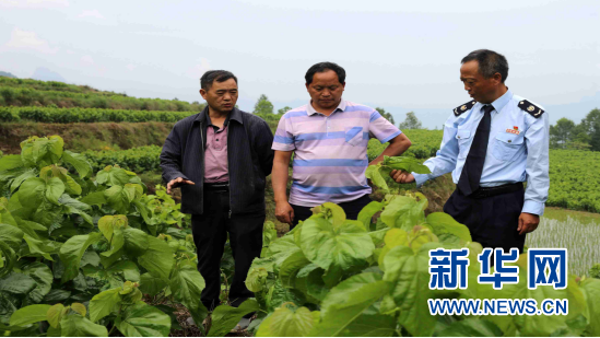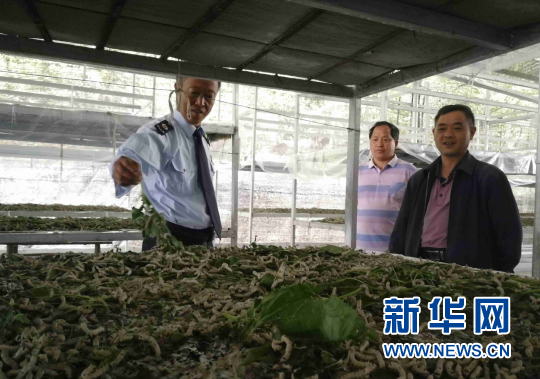 養(yǎng)蠶大戶鄧遂洪(左一)介紹桑樹防蟲技術(shù)。新華網(wǎng)發(fā)(重慶稅務供圖)