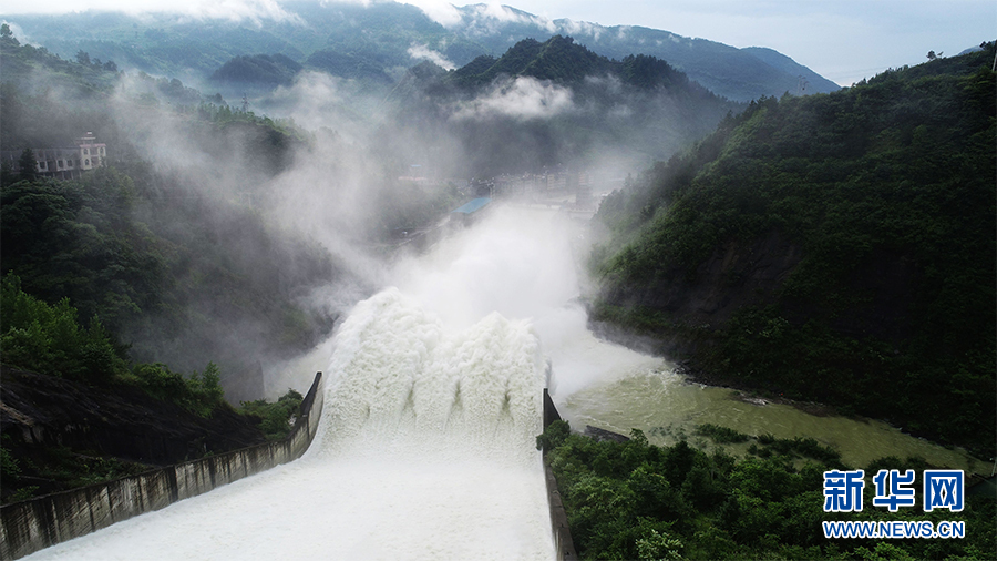 受近段時間的強(qiáng)降雨影響,重慶市酉陽縣多條河流河水猛漲,部分水庫接近汛限水位。6月18日,位于酉陽縣境內(nèi)的金家壩水庫開閘泄洪,確保水庫安全。新華網(wǎng)發(fā)(陳碧生 攝)