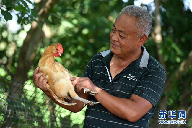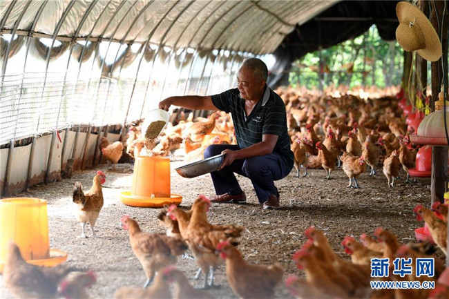 6月26日,在肥西縣花崗鎮(zhèn)楊灣村的土雞養(yǎng)殖基地里,黃榮春在雞棚里忙碌。新華社記者 劉軍喜 攝