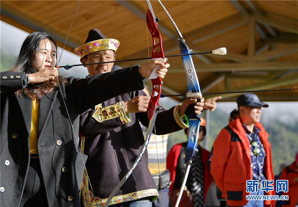 一名游客在當(dāng)?shù)剞r(nóng)牧民的指導(dǎo)下射擊響箭(7月26日攝)。新華社記者張汝鋒攝