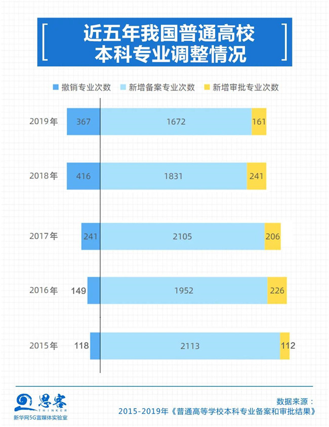 4近五年我國普通高校本科專業(yè)調(diào)整情況 近年來,隨著經(jīng)濟(jì)社會的不斷發(fā)展,高校的專業(yè)設(shè)置也在不斷更迭,可供選擇的專業(yè)也越來越多。2015年開始,全國高校每年增設(shè)專業(yè)數(shù)量在2000個左右,撤銷專業(yè)的數(shù)量也超過100個。