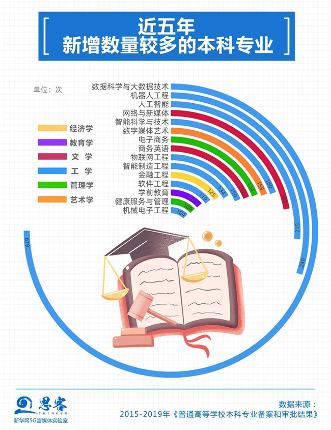 工學(xué)新增專業(yè)數(shù)量遙遙領(lǐng)先。數(shù)據(jù)顯示,近五年新增數(shù)量較多的數(shù)據(jù)科學(xué)與大數(shù)據(jù)技術(shù)、機器人工程和人工智能等專業(yè)都屬于工學(xué)。這些專業(yè)也是特設(shè)專業(yè)(專業(yè)代碼后加T表示),根據(jù)高校的辦學(xué)特色或者是近幾年來人才的培養(yǎng)特殊需求設(shè)置。與每五年調(diào)整一次的基本專業(yè)不同,特設(shè)專業(yè)可以每年調(diào)整一次,兩種特性的專業(yè)可以分別管理。